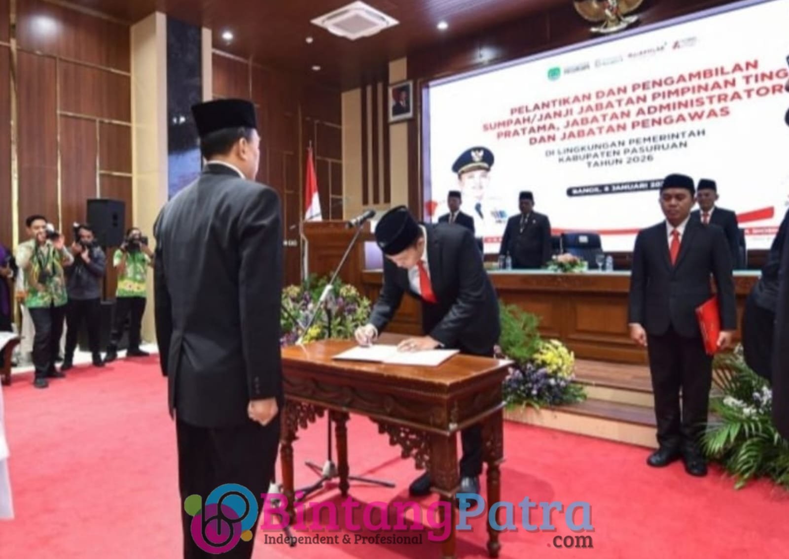 Pasuruan – BintangPatra.com – Bupati Pasuruan Rusdi Sutejo melantik 297 pejabat di lingkungan Pemerintah Kabupaten Pasuruan. Pelantikan digelar di Auditorium Mpu Sindok, Kompleks Kantor Bupati Pasuruan, Kamis (8/1/2026) siang.