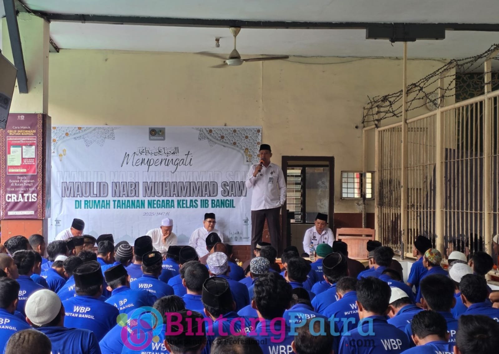 Pasuruan – BintangPatra.com – Rumah Tahanan Negara (Rutan) Kelas IIB Bangil menggelar peringatan Maulid Nabi Muhammad SAW 1447 H/2025 yang berlangsung khidmat di Aula Blok Hunian, Kamis (11/09). Kegiatan ini dibuka langsung oleh Kepala Rutan Bangil, Yanuar Rinaldi, dan diikuti oleh seluruh warga binaan.
