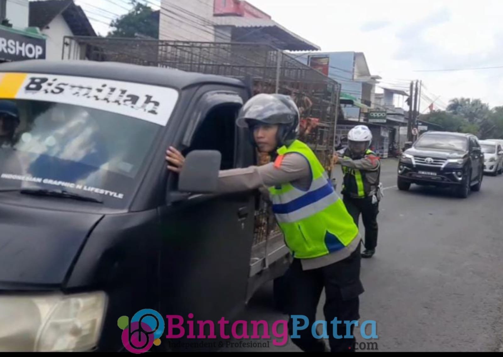 “Tadi kami menerima laporan ada kendaraan mogok di badan jalan, lalu kami bantu untuk penanganan agar tidak menimbulkan kemacetan,” ujar Iptu Putut usai bantu dorong mobil mogok.