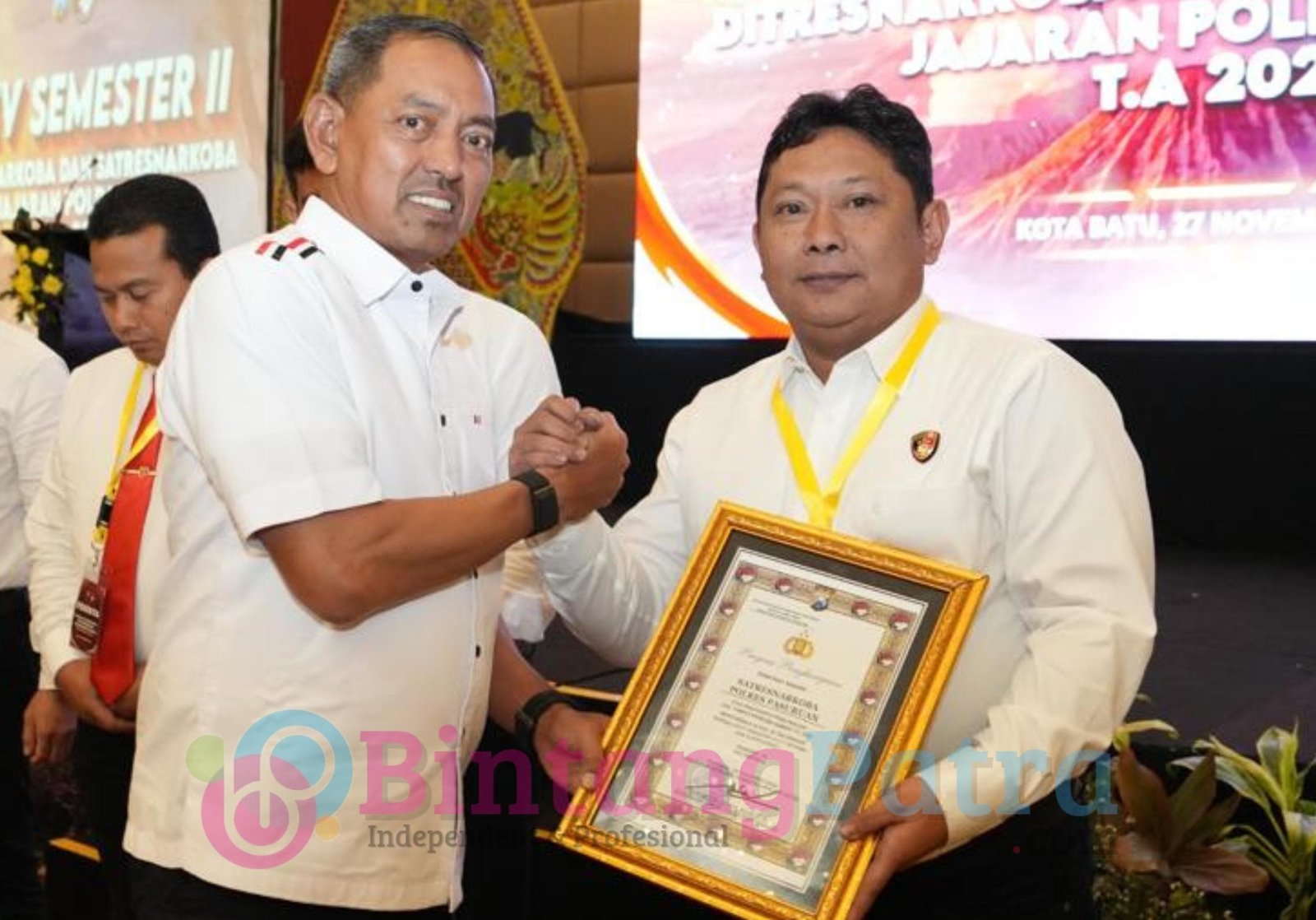 Pasuruan, BintangPatra.com – Satresnarkoba Polres Pasuruan meraih dua penghargaan sekaligus dalam kegiatan Analisis dan Evaluasi (Anev) Semester II Ditresnarkoba Polda Jawa Timur TA 2025.